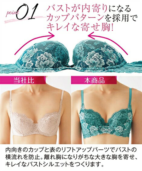 内向きのカップと表のリフトアップパーツでバストの横流れを防止。