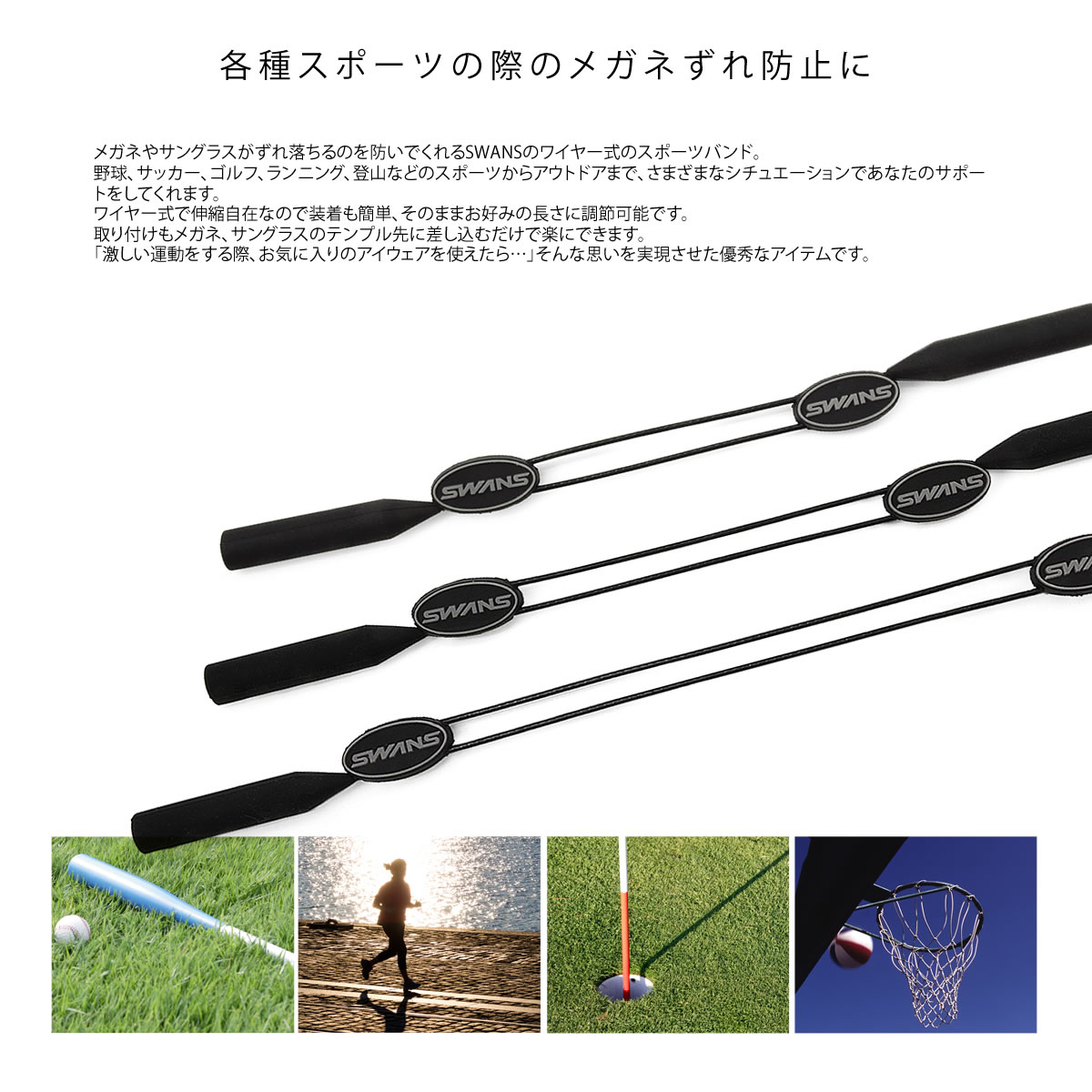 メガネやサングラスがずれ落ちるのを防いでくれるSWANSのワイヤー式のスポーツバンド。